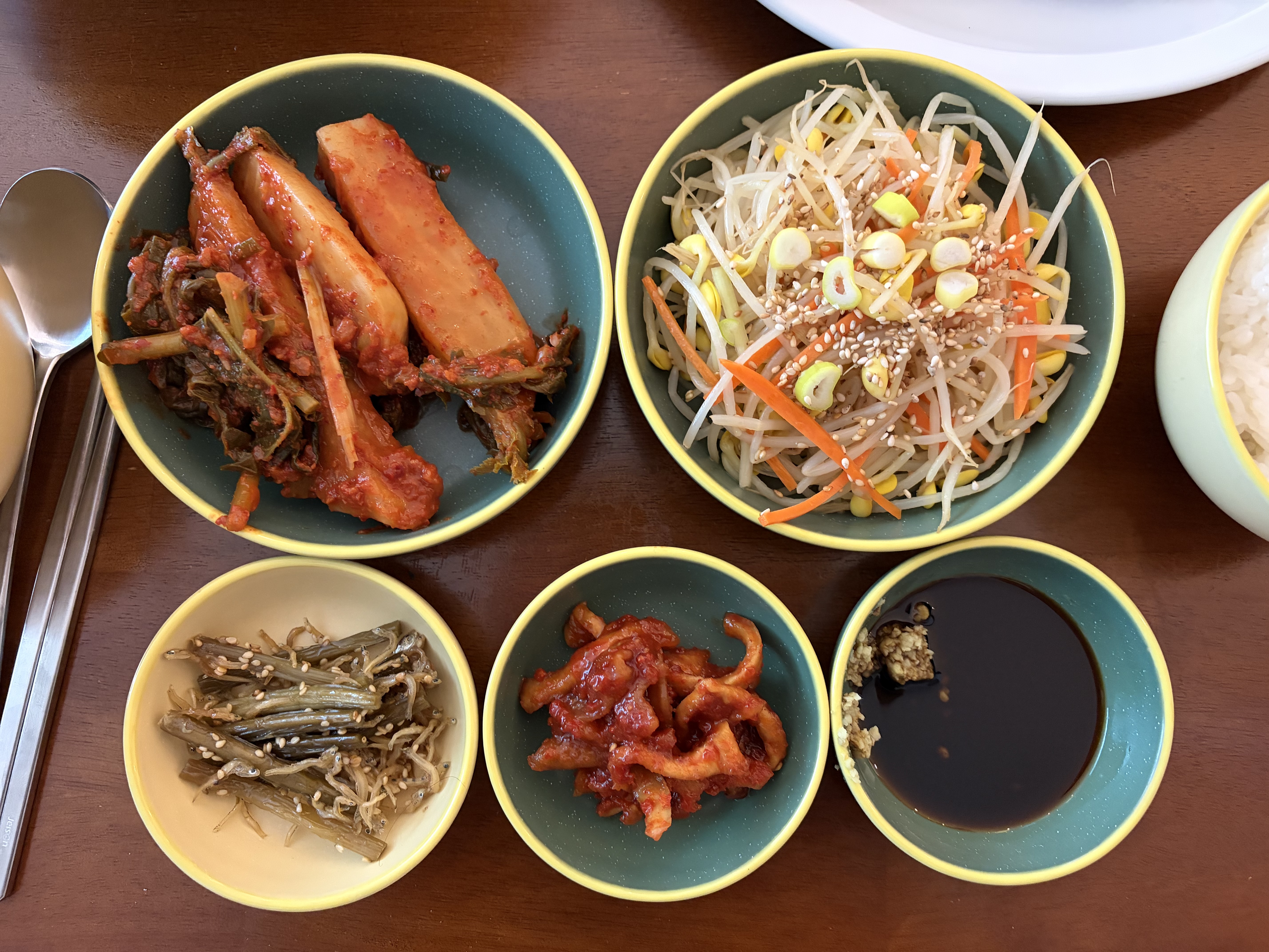 짭짤 달달하게 잘 무친 콩나물 무침과 밑반찬들.
