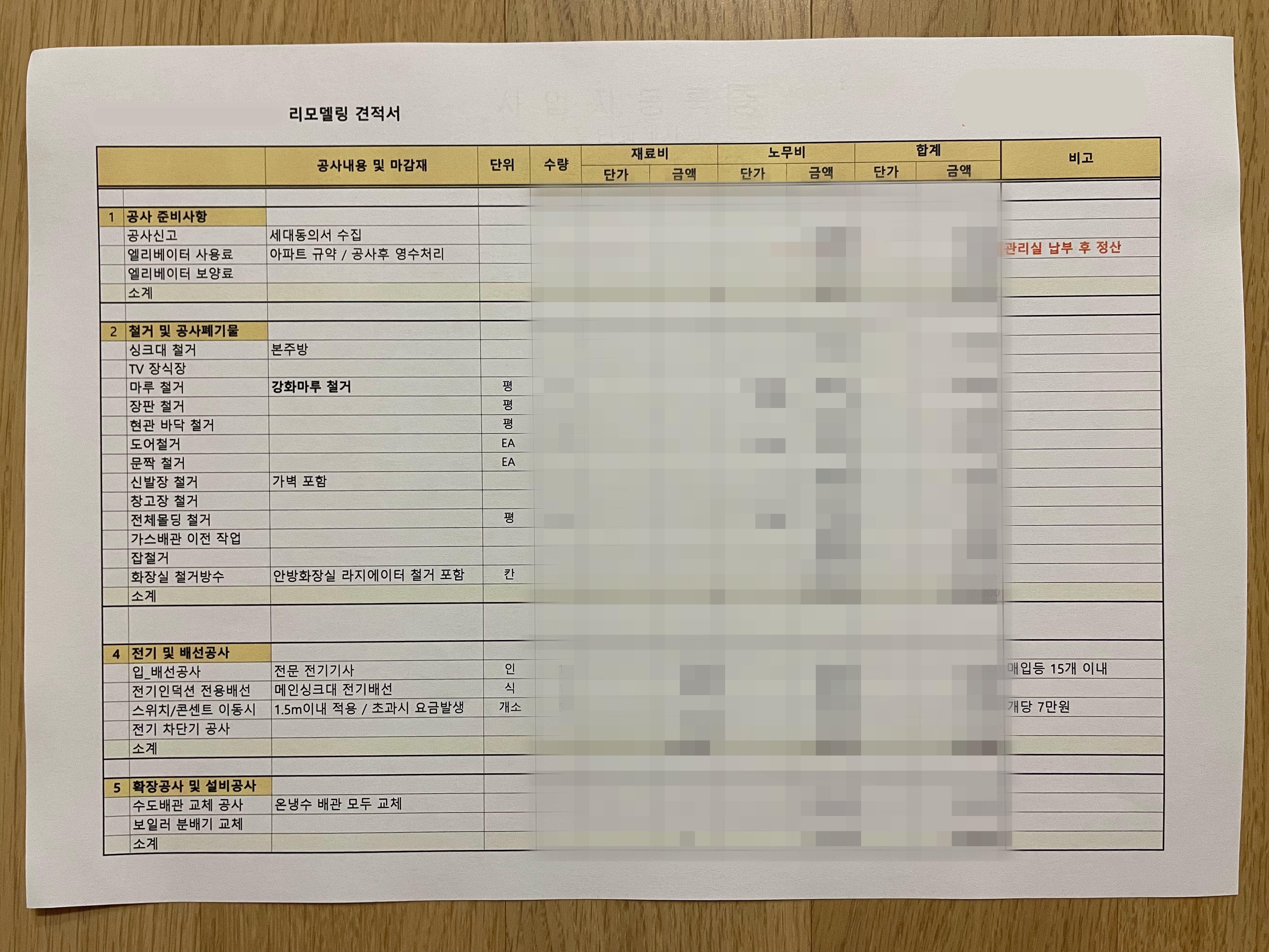 우리 집에 대한 공사 내역과 견적서를 받았다.