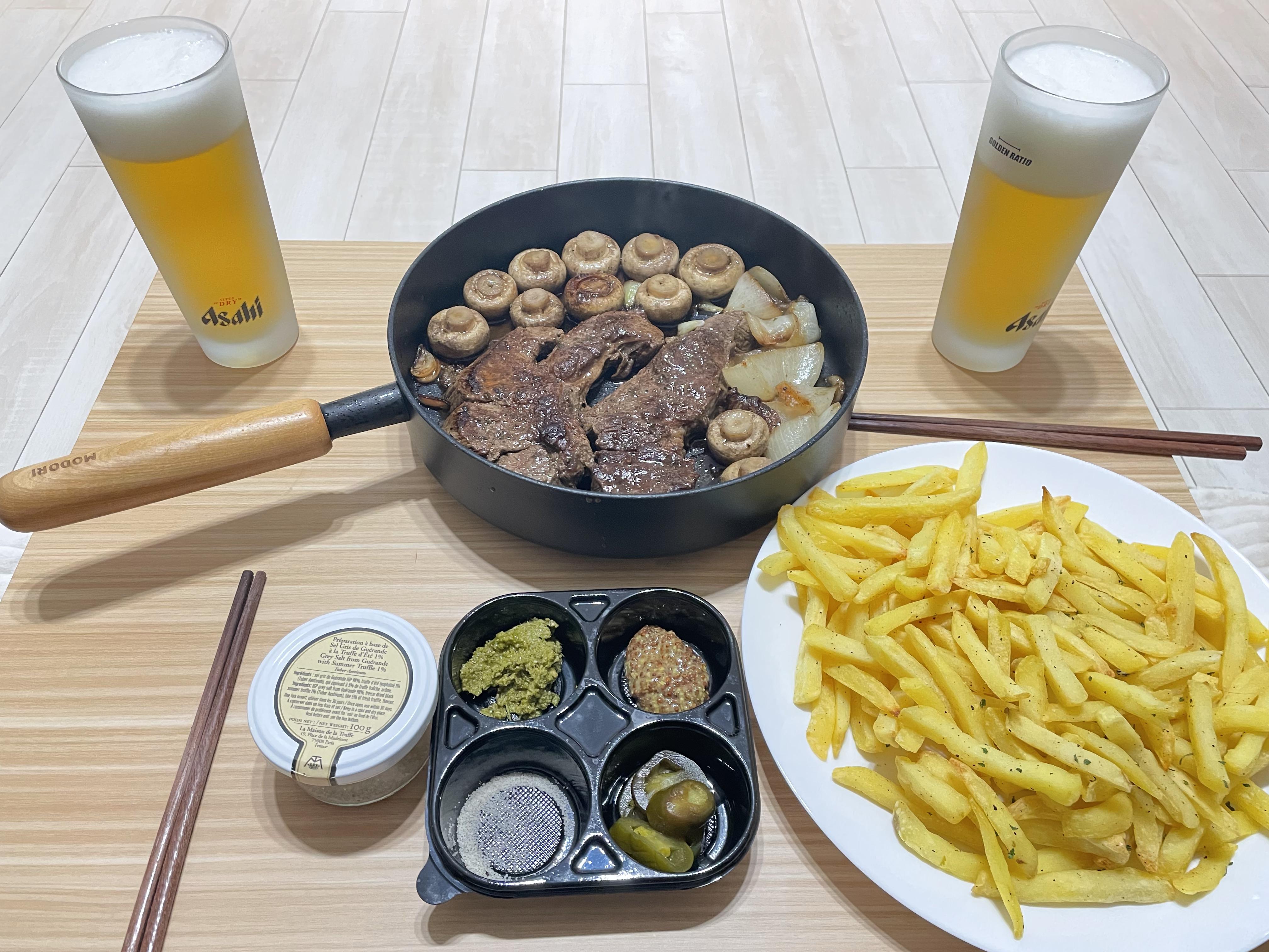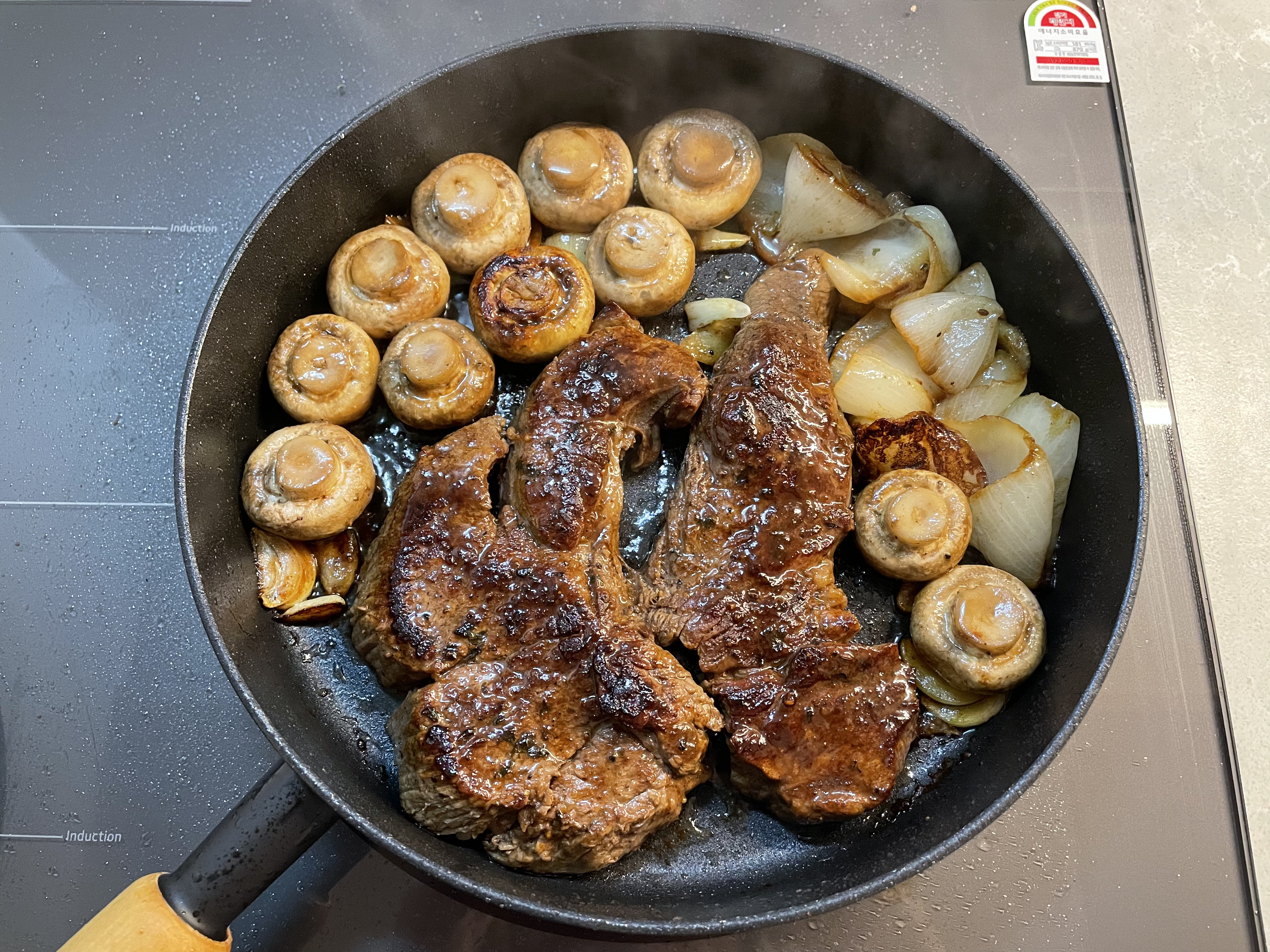 오늘은 고기 옆에 잘 구워진 버섯도 더했다.