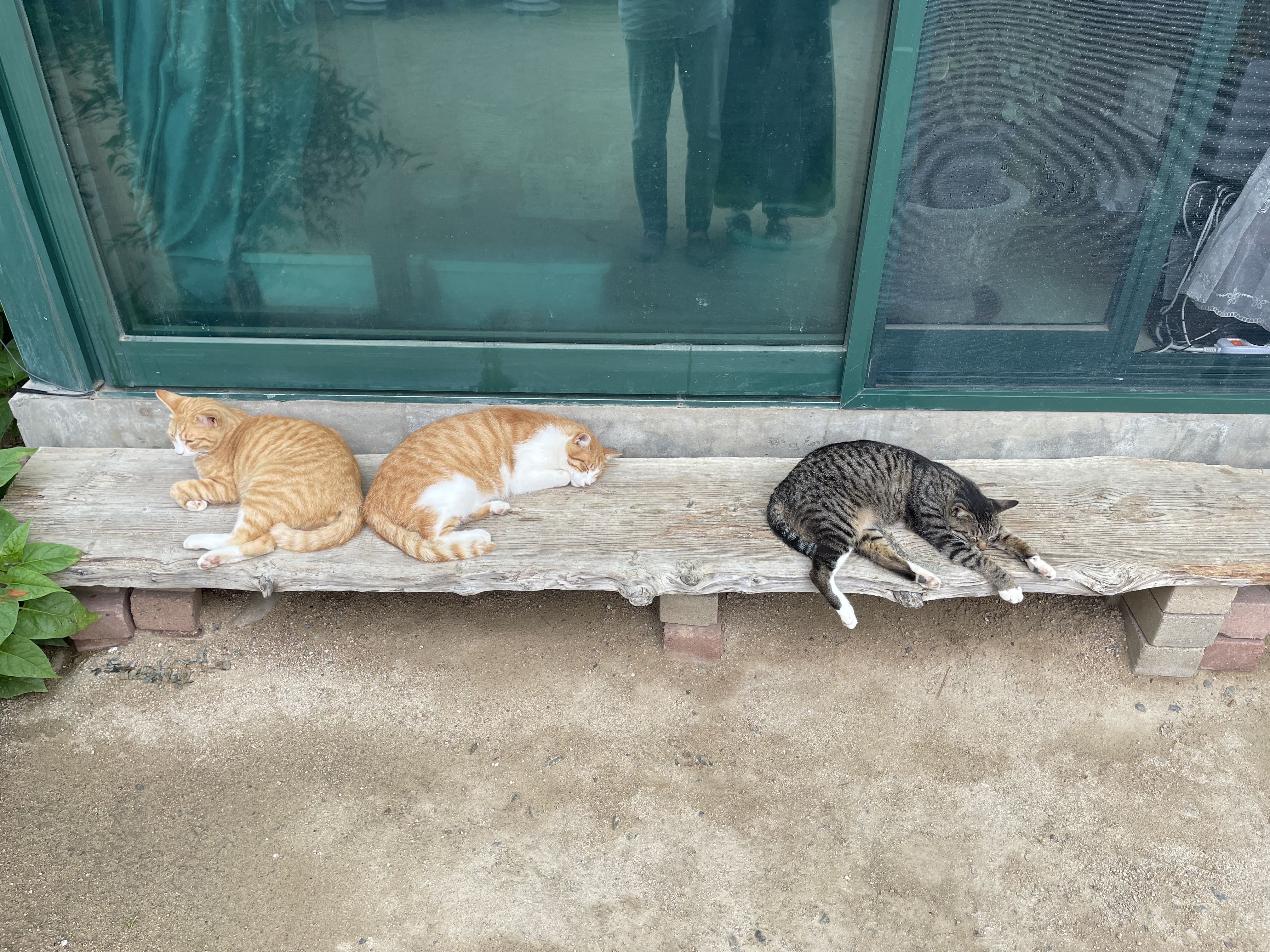 테라스에는 냥이 몇 마리가 여유롭게 낮잠을 자고 있었다.