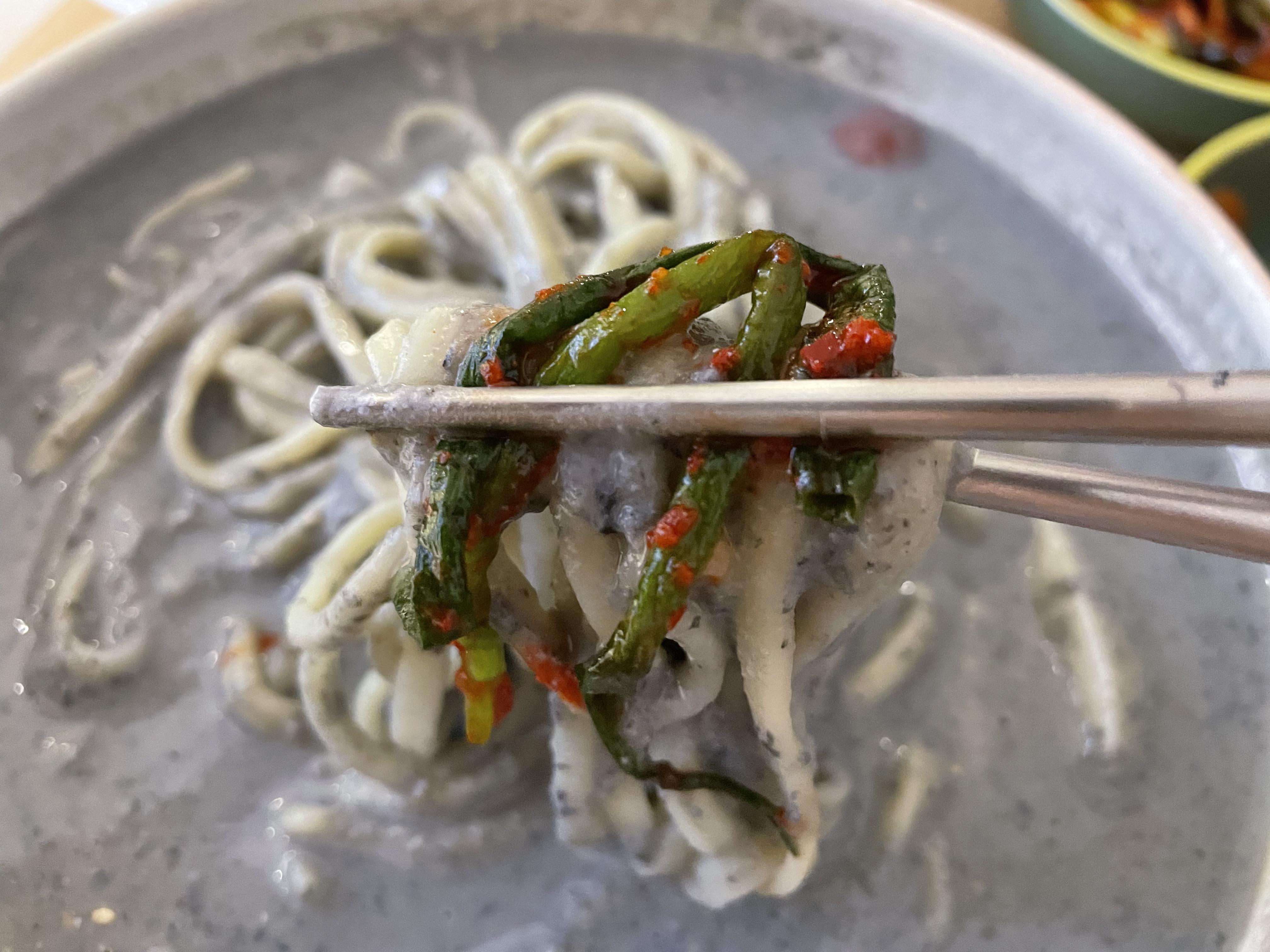 맛있는 콩국수에 매콤달콤한 파김치 하나 얹어 먹는다.
