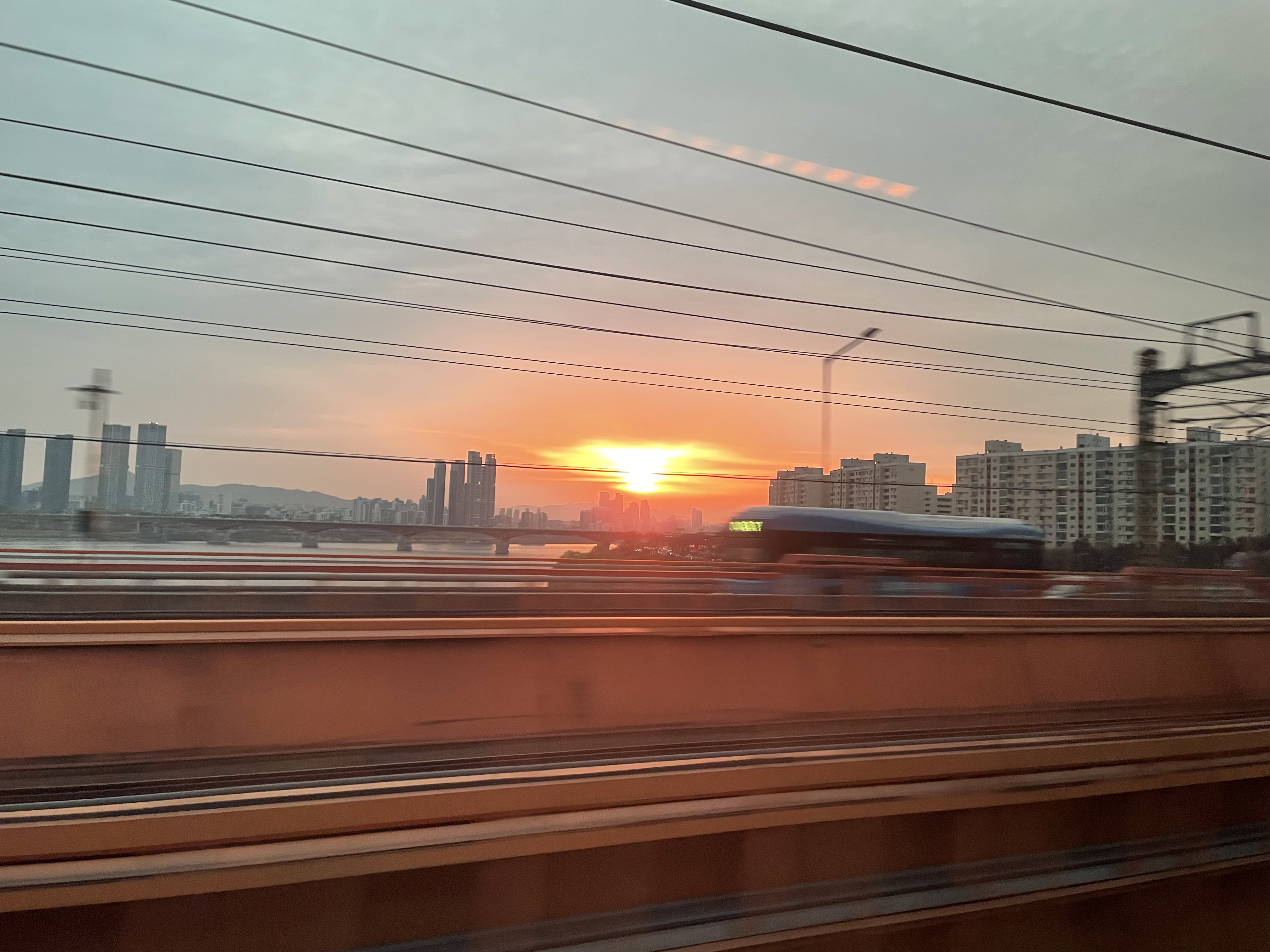 한강다리 위를 달리는 버스 안에서 본 일출.