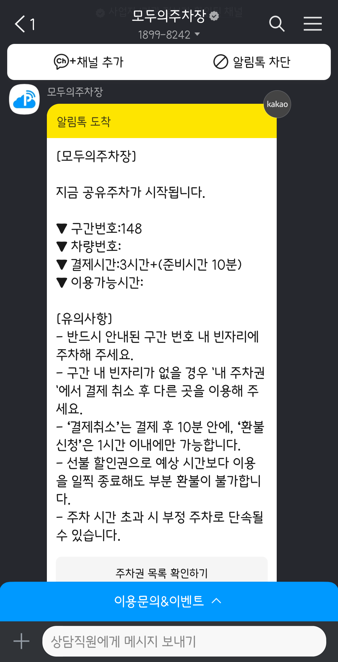 결제하면 이용시간 등 정보가 알림톡으로 온다.