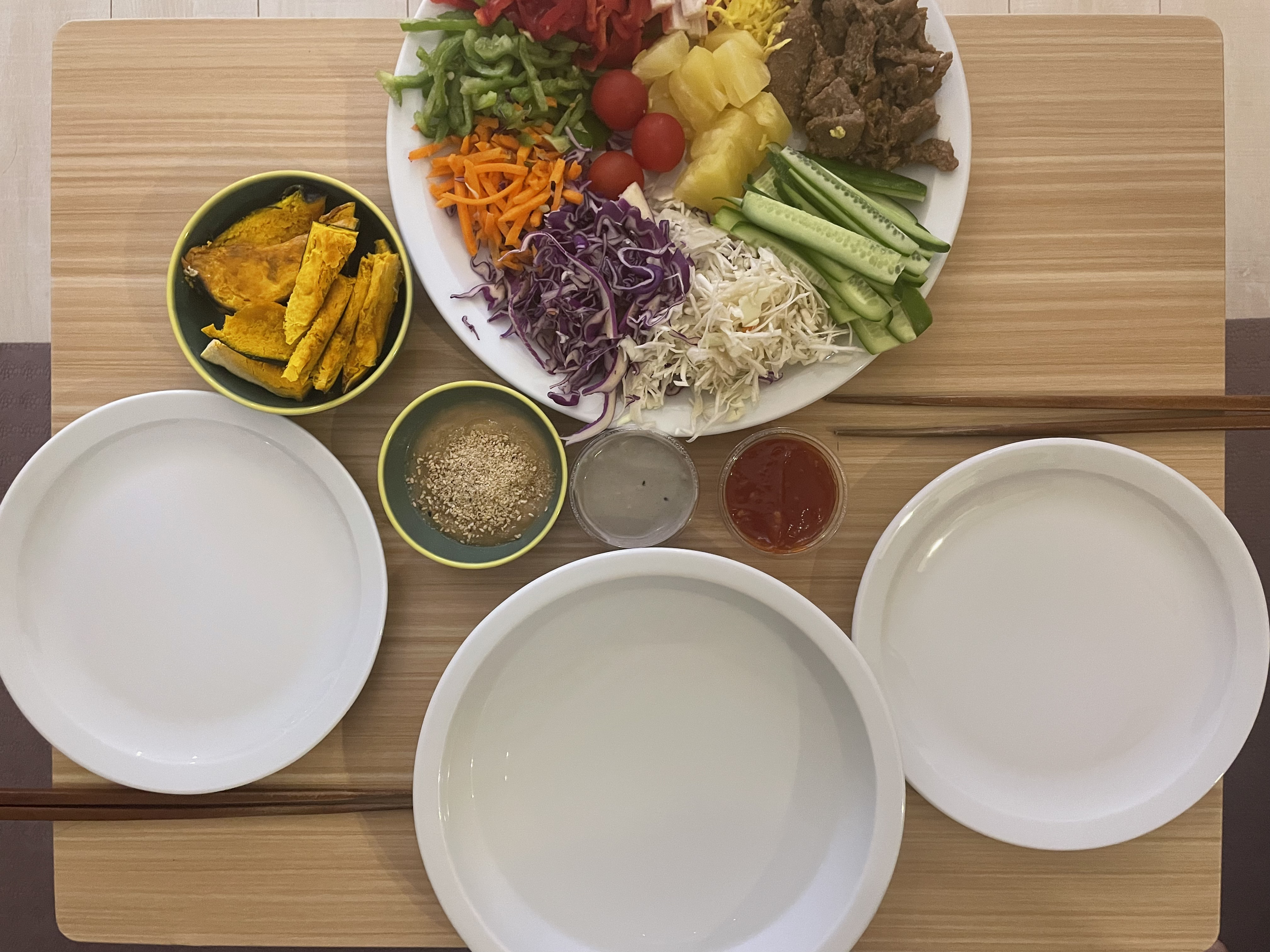 먹고 싶은 재료들을 이것저것 담고 라이스페이퍼로 감싸준다.