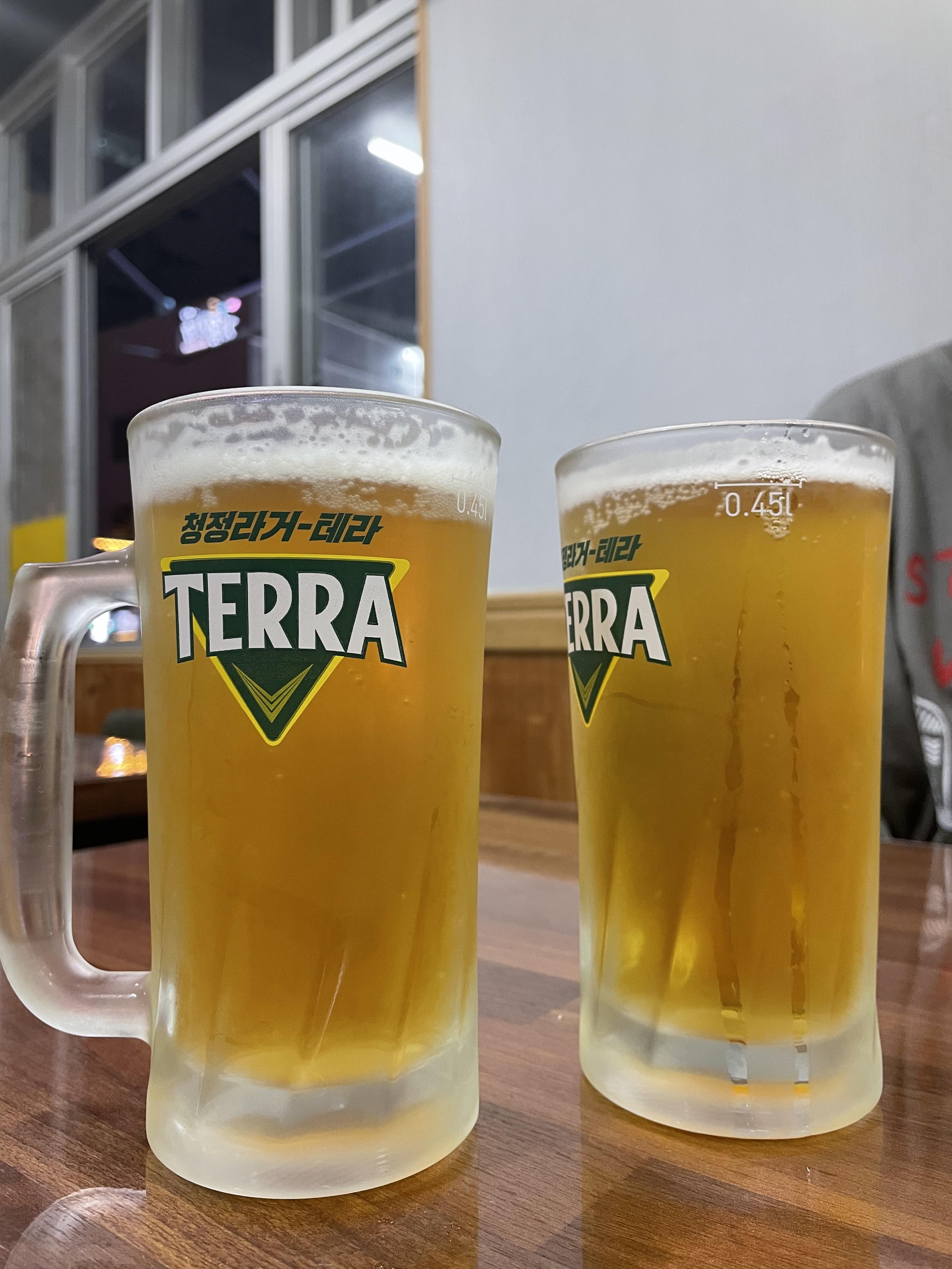 여행의 늦은 시작을 기념하며 시원한 맥주 한잔.