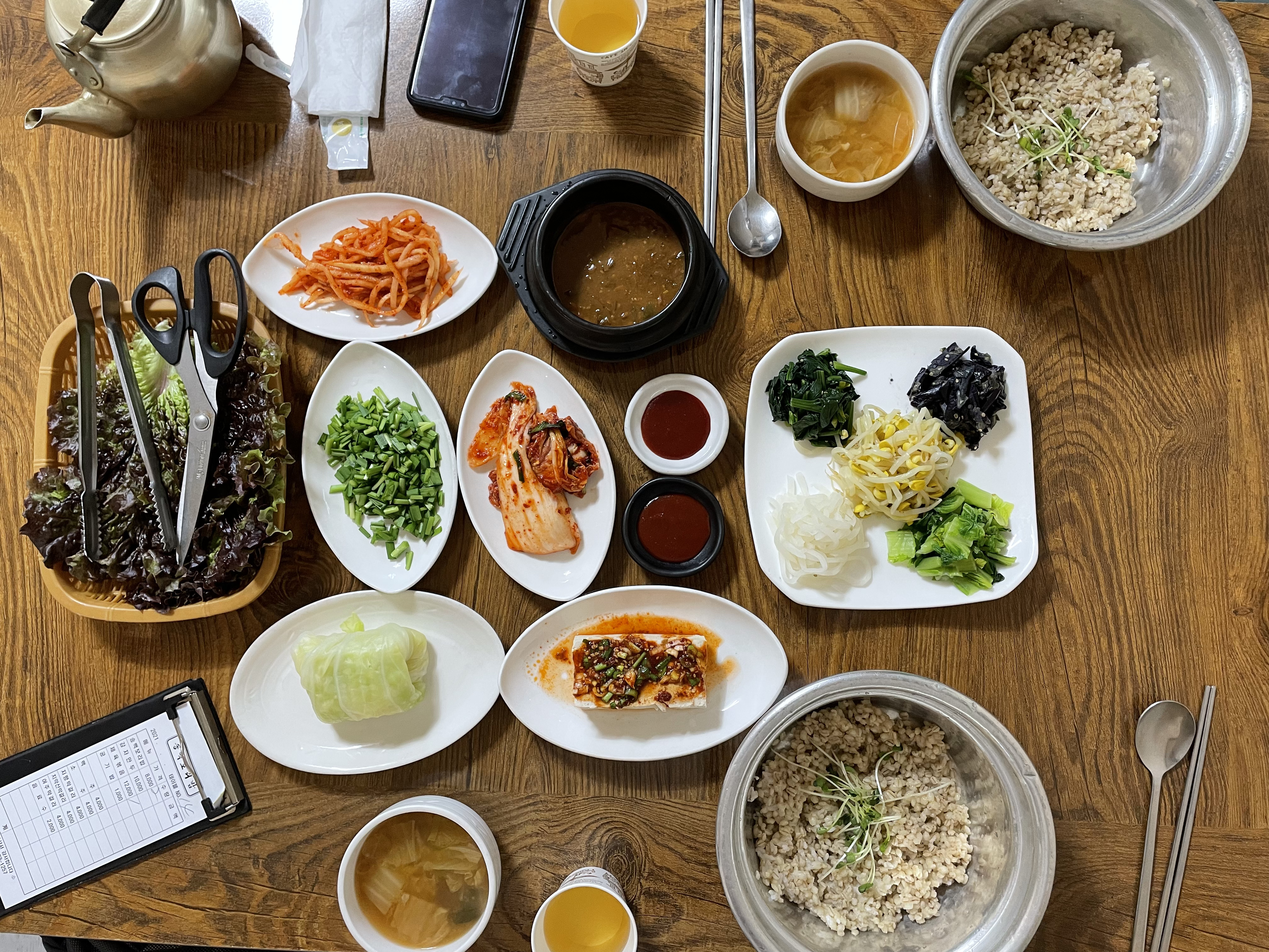 구수한 보리밥과 이것저것 나물, 김치도 맛있고, 담백한 양배추와 두부까지.