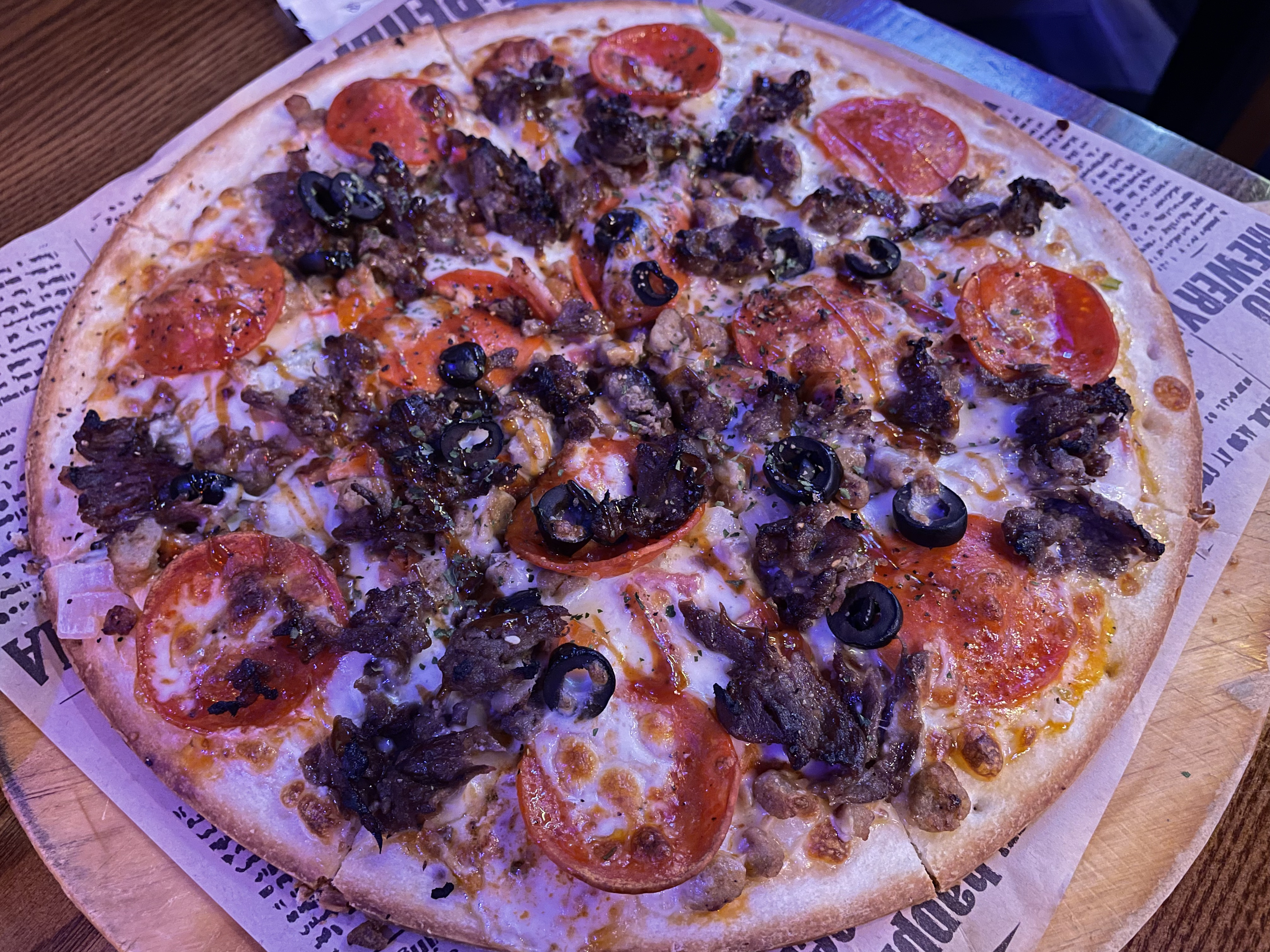 페퍼로니와 불고기, 올리브 등등 토핑이 가득 올라가 있다.