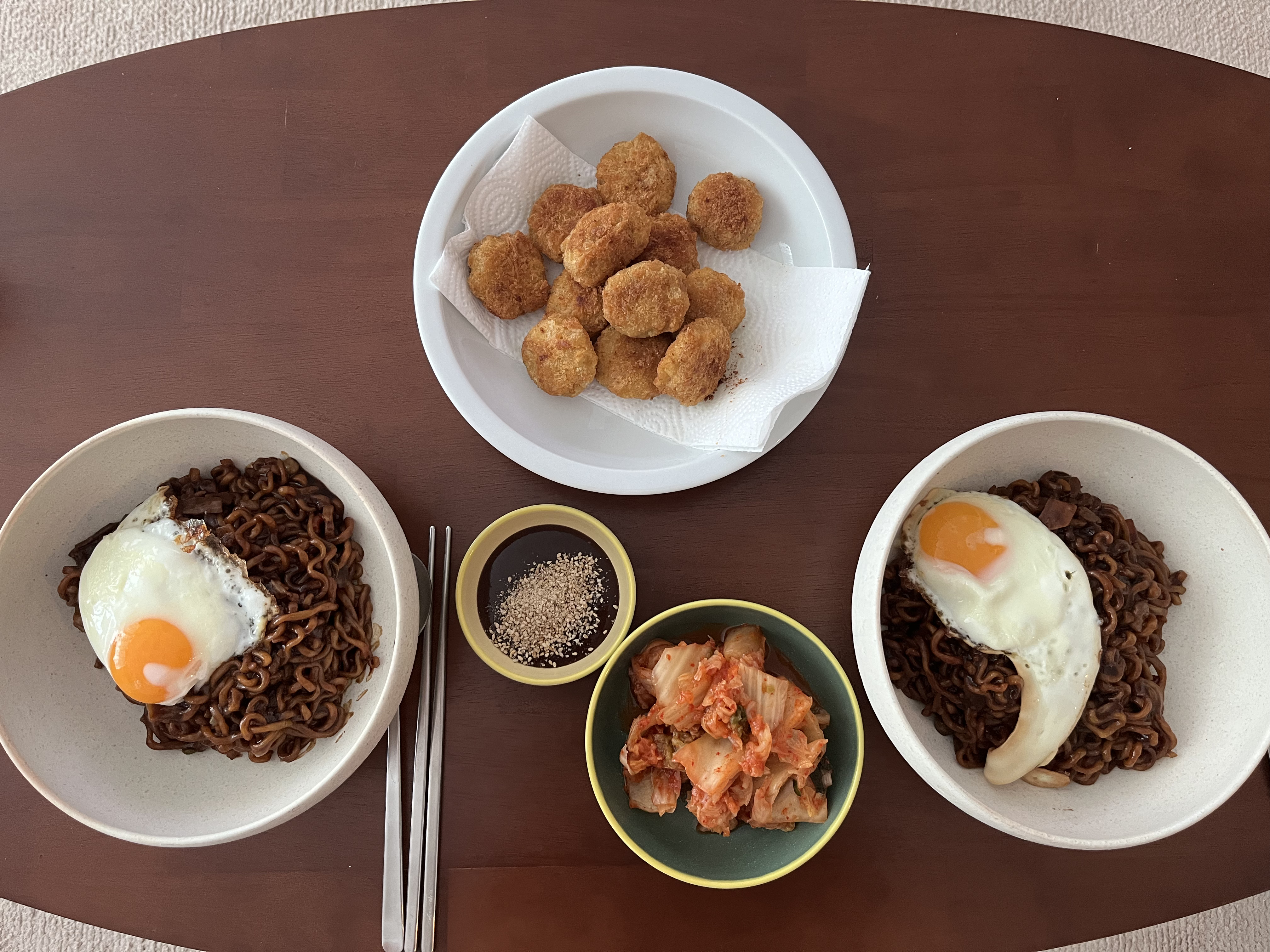 짜파게티와 꼬마돈까스, 그리고 새콤하니 맛있는 김치.