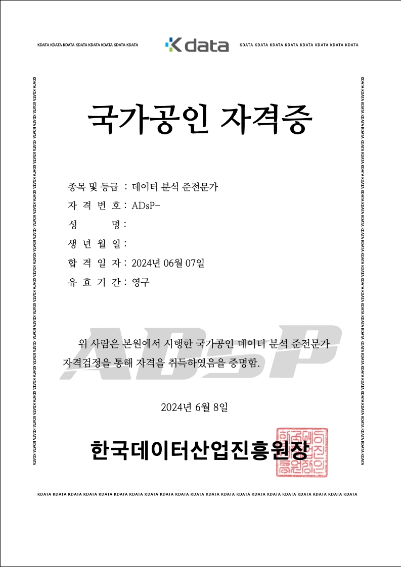 데이터분석 준전문가(ADsP : Advanced Data Analytics Semi-Professional)란 데이터 이해에 대한 기본지식을 바탕으로 데이터분석 기획 및 데이터분석 등의 직무를 수행하는 실무자를 말한다.