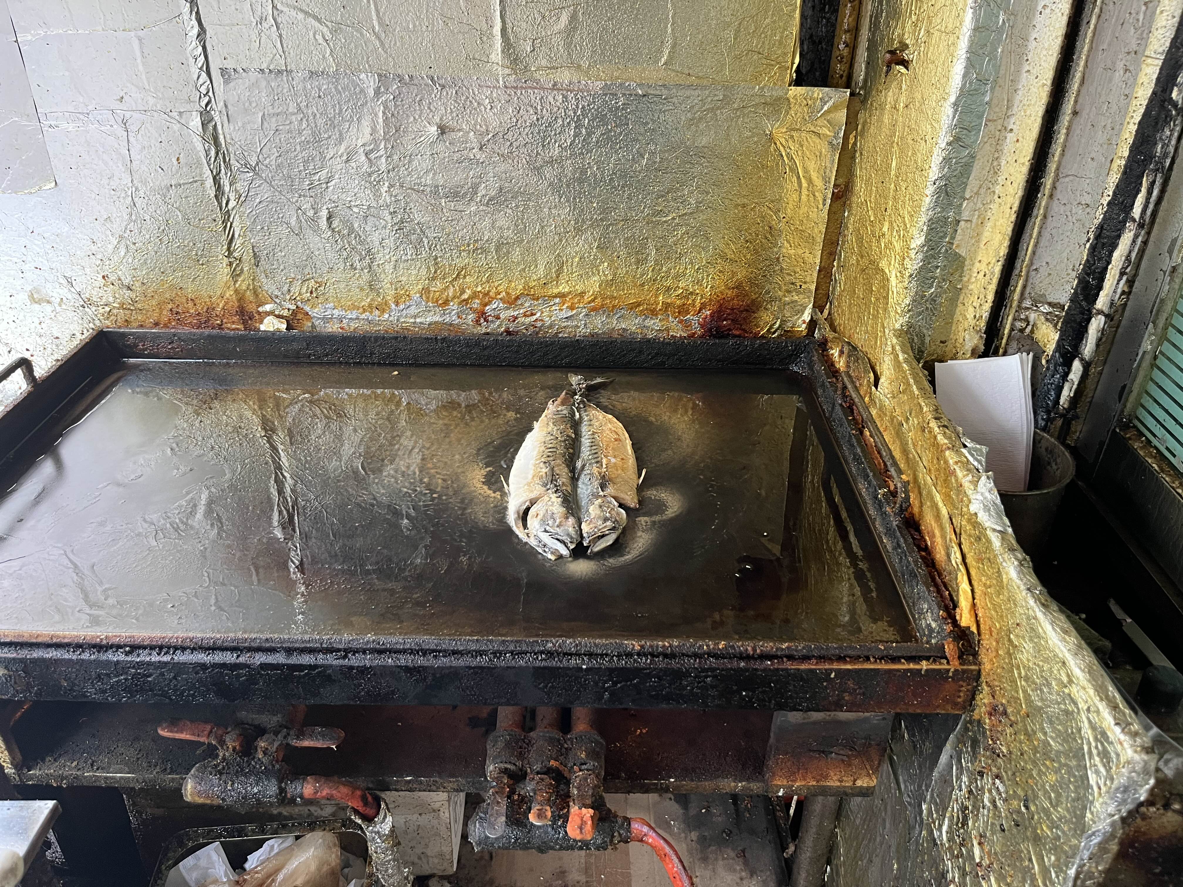 커다란 고등어 한 마리가 통째로 불판 위에 올라간다.