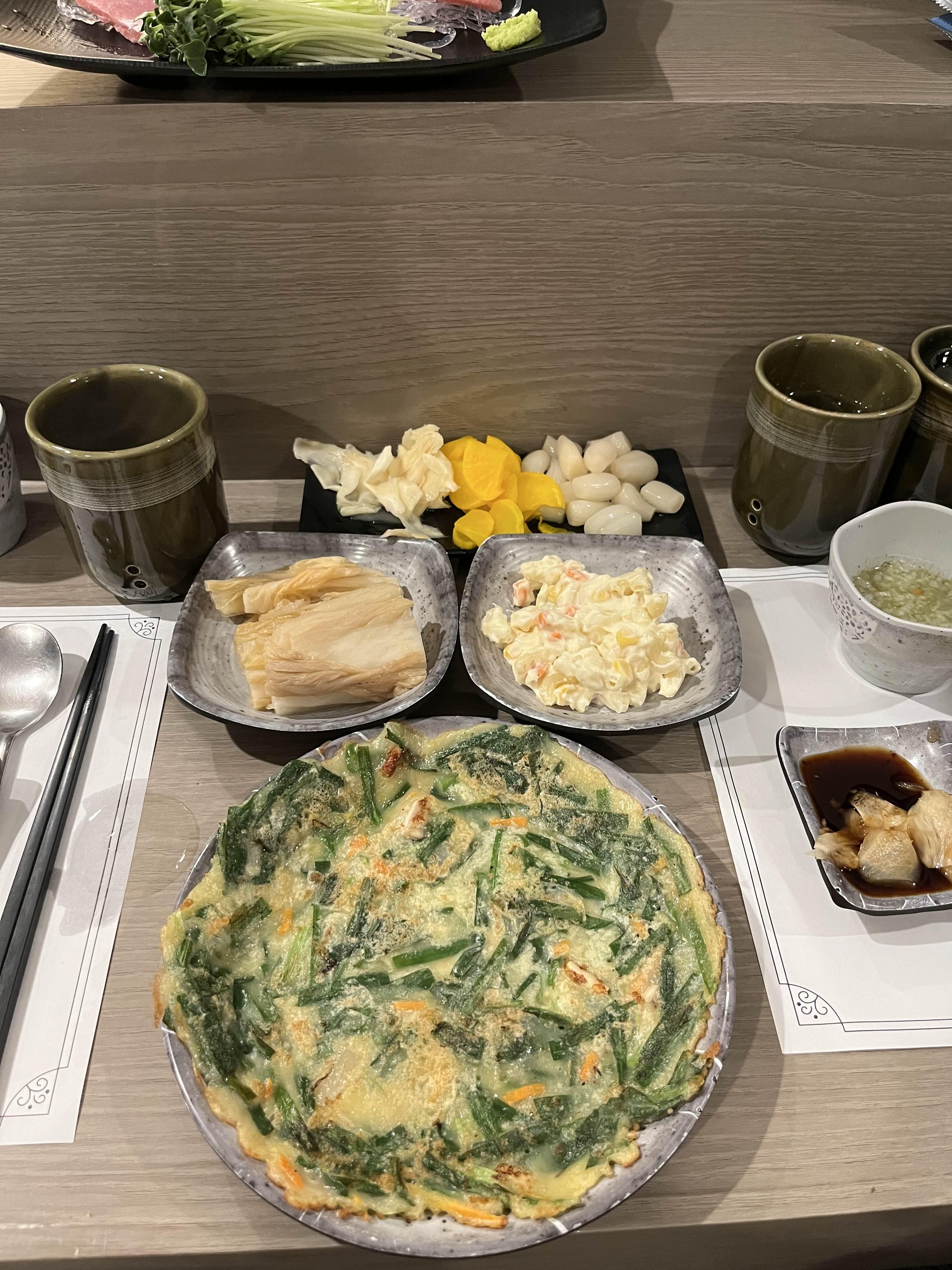 참치집의 기본반찬인 생강, 단무지, 락교, 백김치, 마카로니 샐러드까지.
