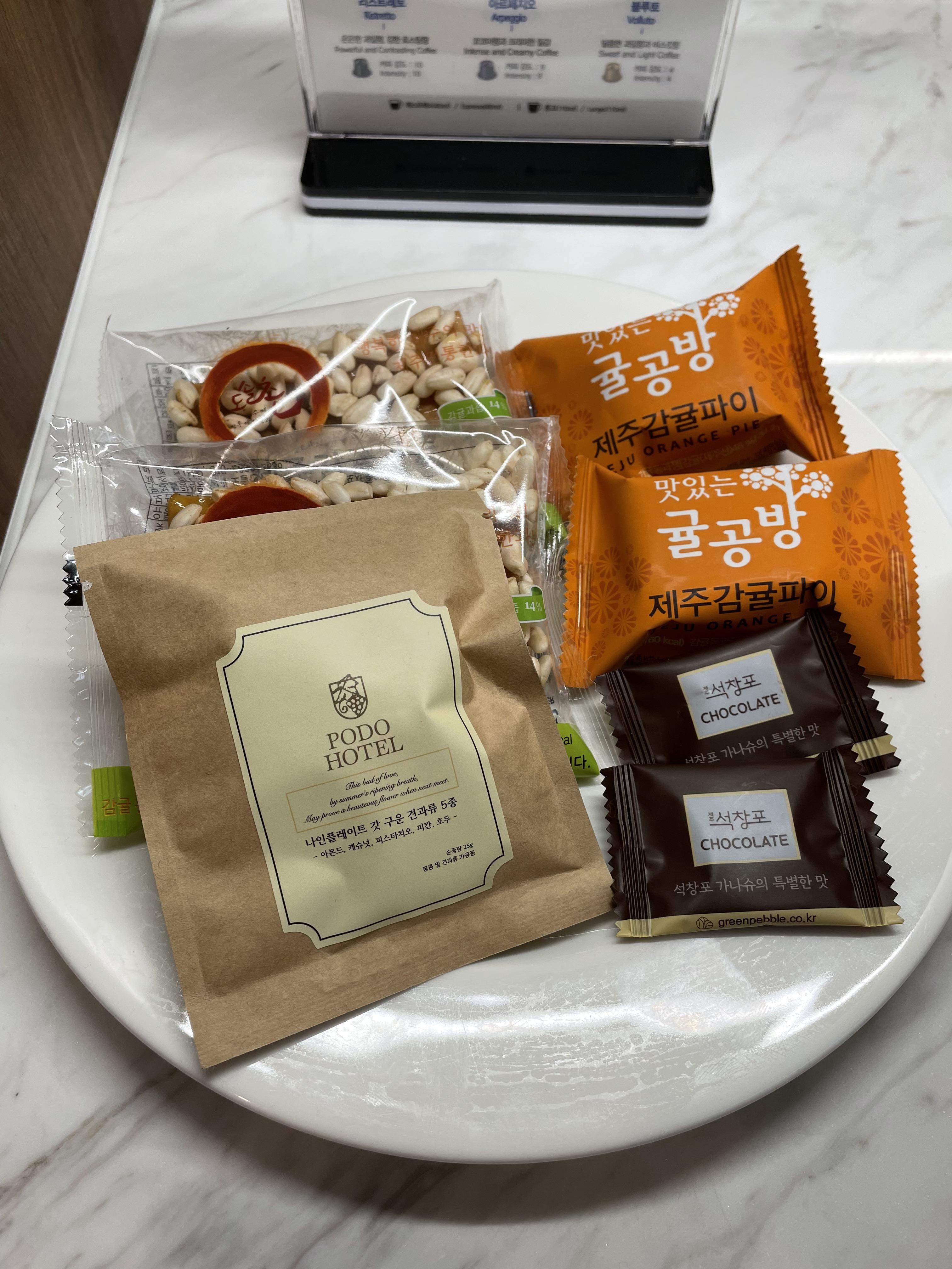 간단히 마련돼있는 웰컴 과자도 전부 제주에서 나는 것들이 주다.