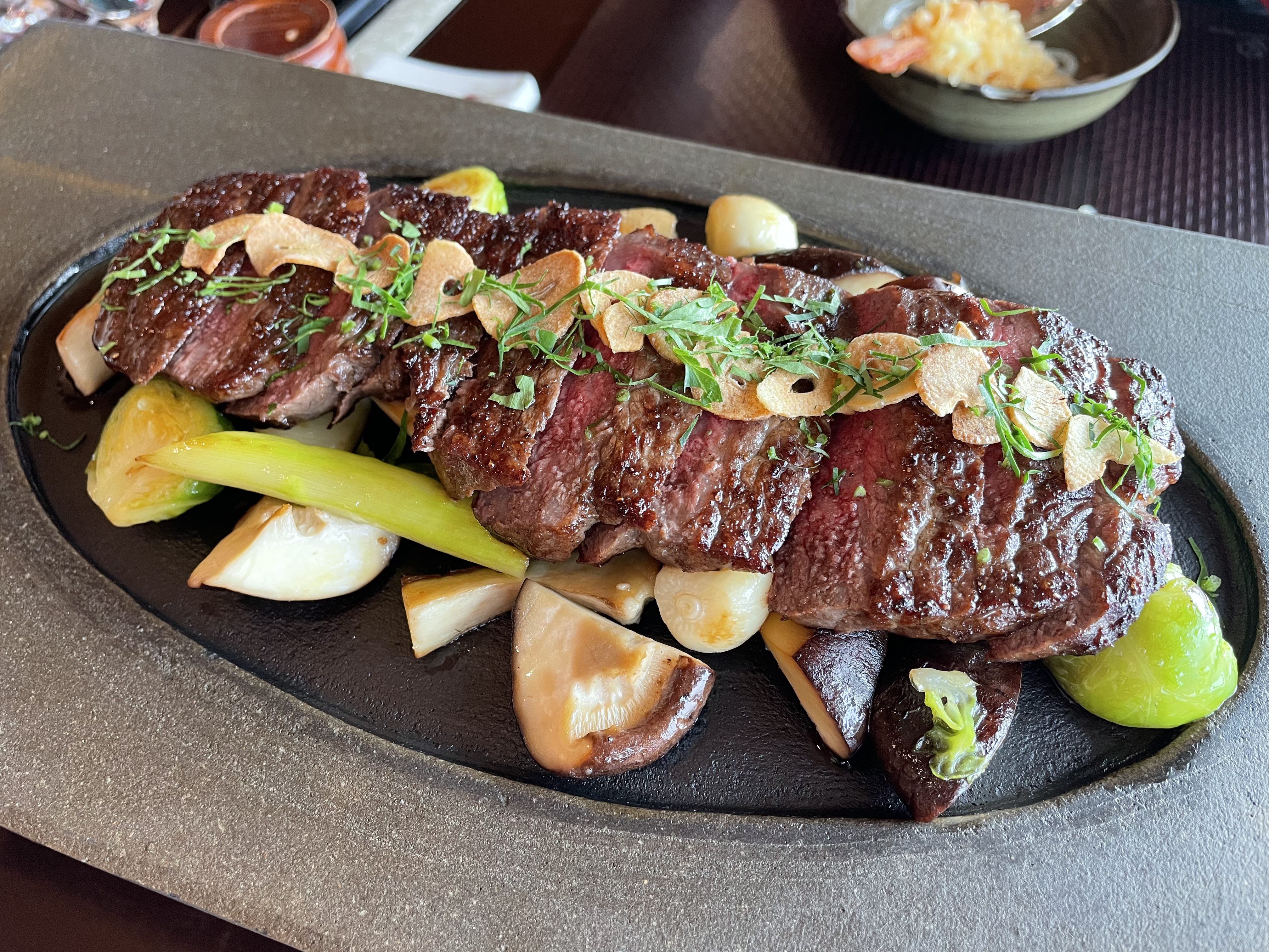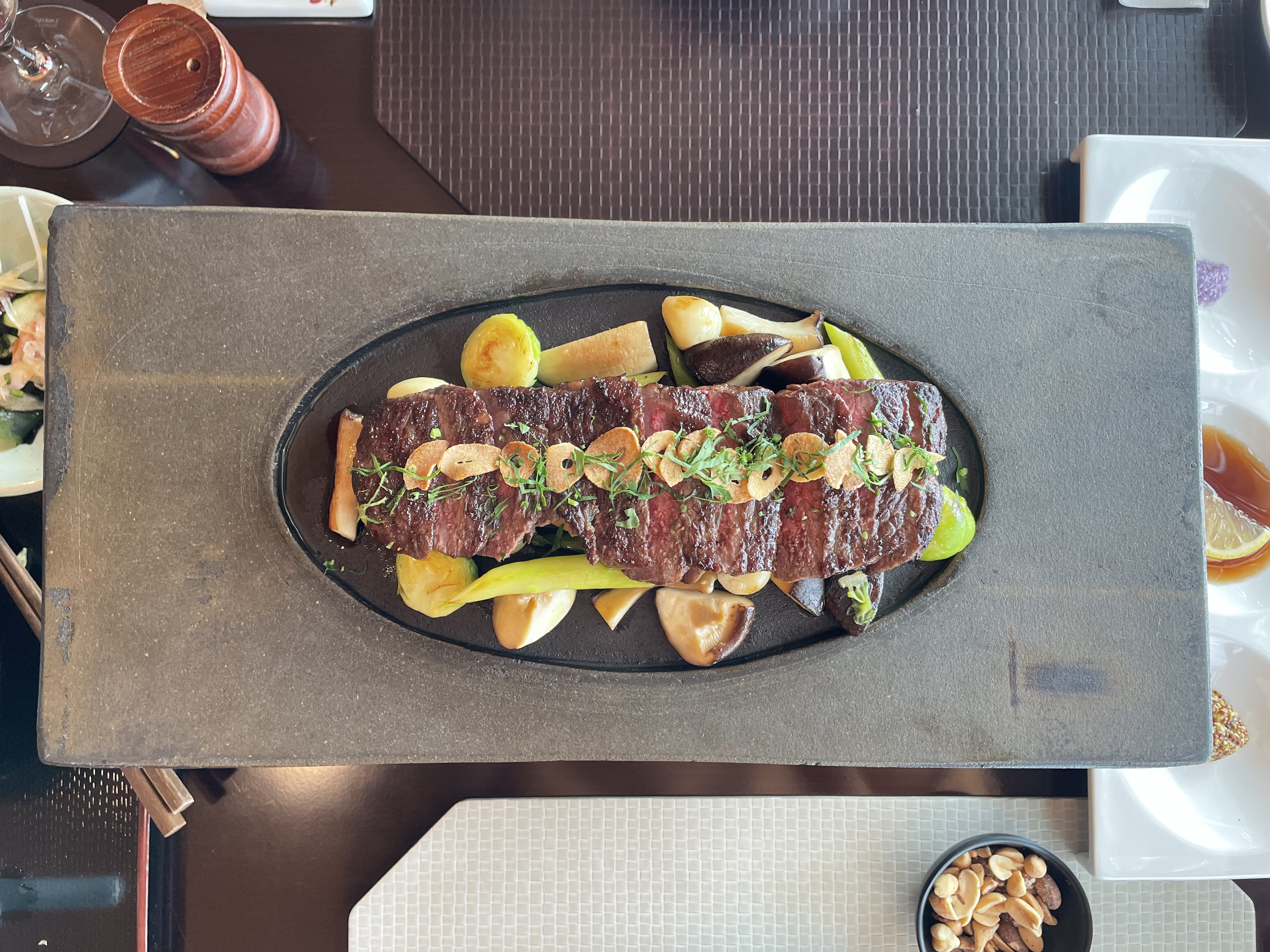 딱 우리가 원하는 굽기로 구워서 이것저것 야채랑 같이 나온다.