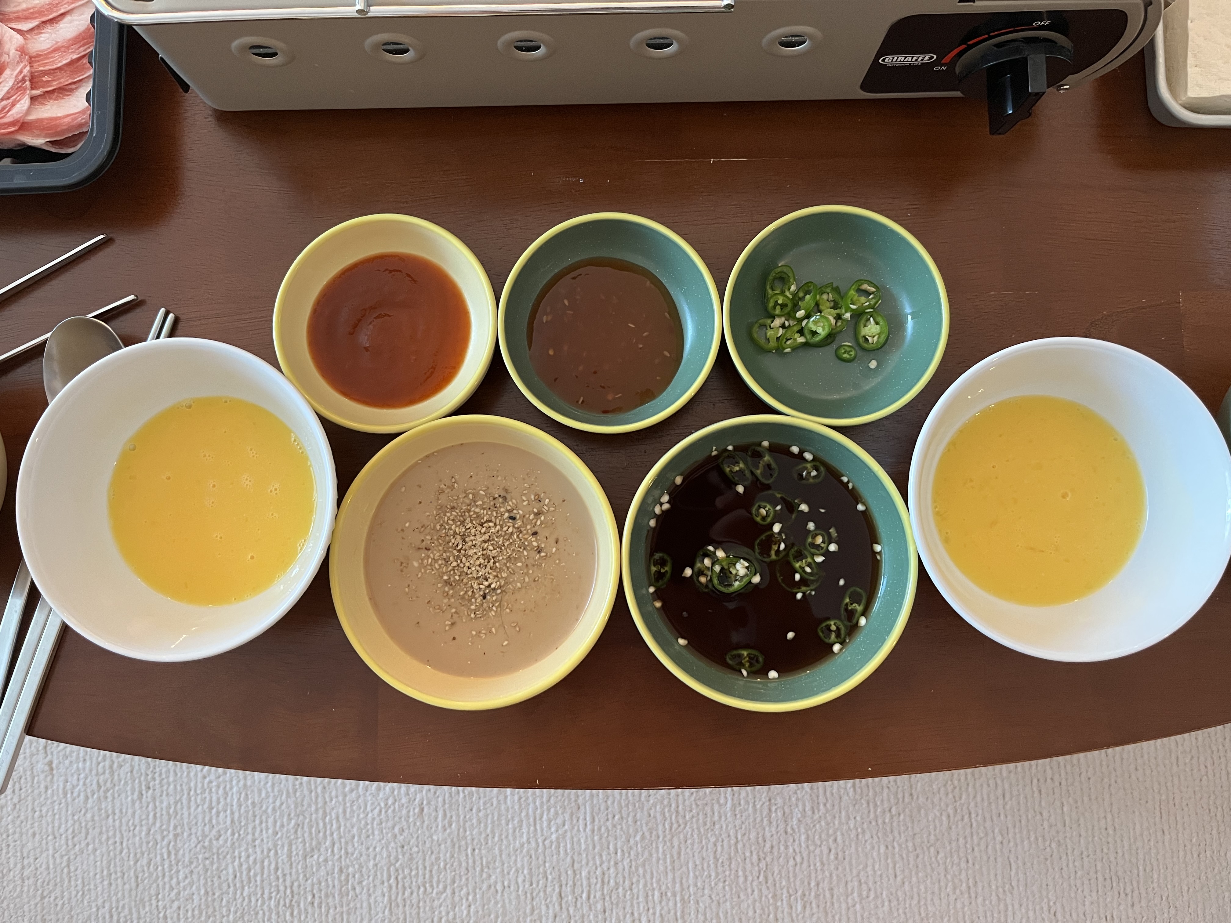 고소한 땅콩소스, 매콤한 청양고추가 들어간 간장소스, 스리라차소스, 그리고 샤브샤브 기본 계란물소스.