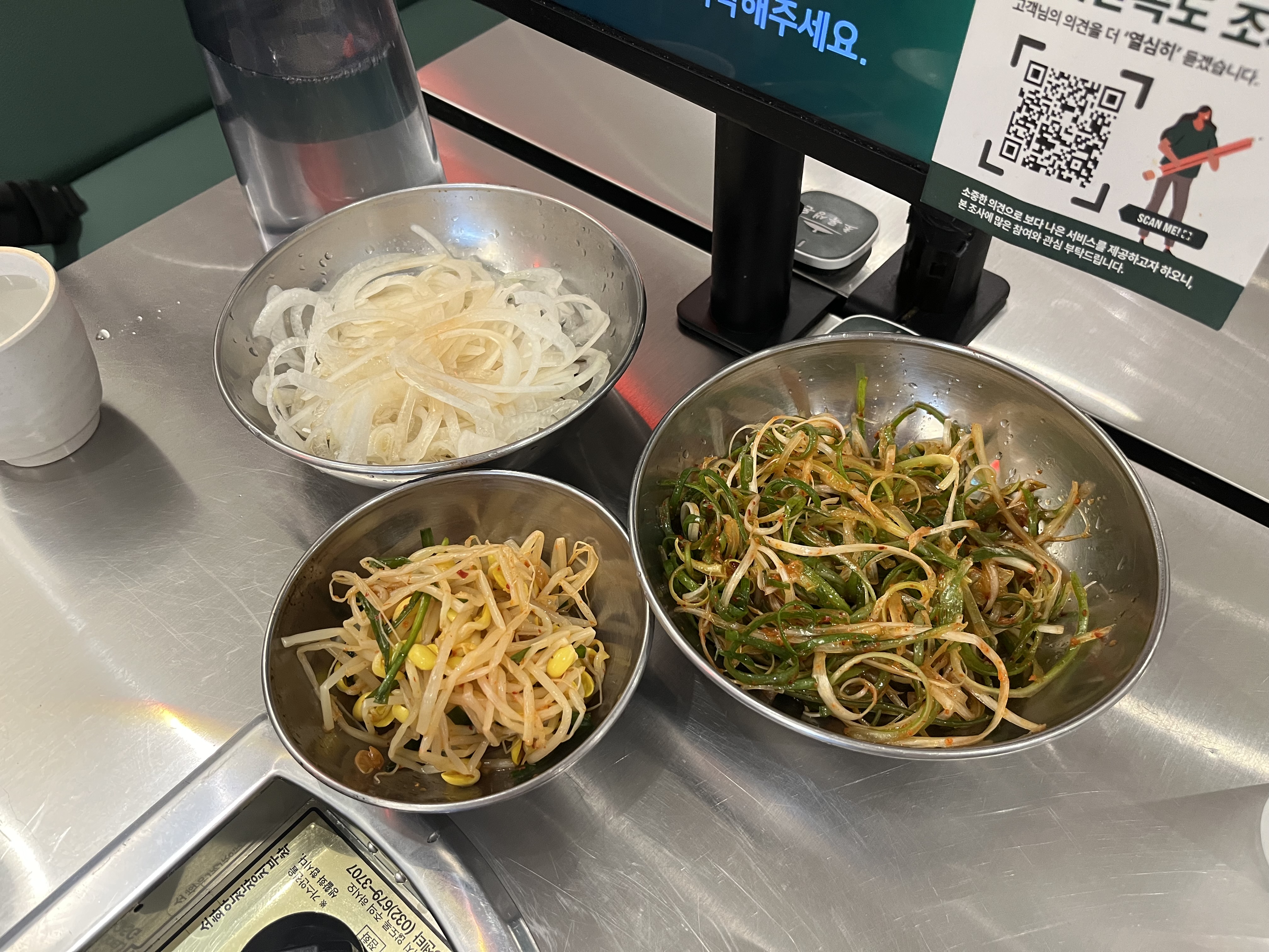 기본찬으로 나오는 콩나물이랑 파채, 양파절임.