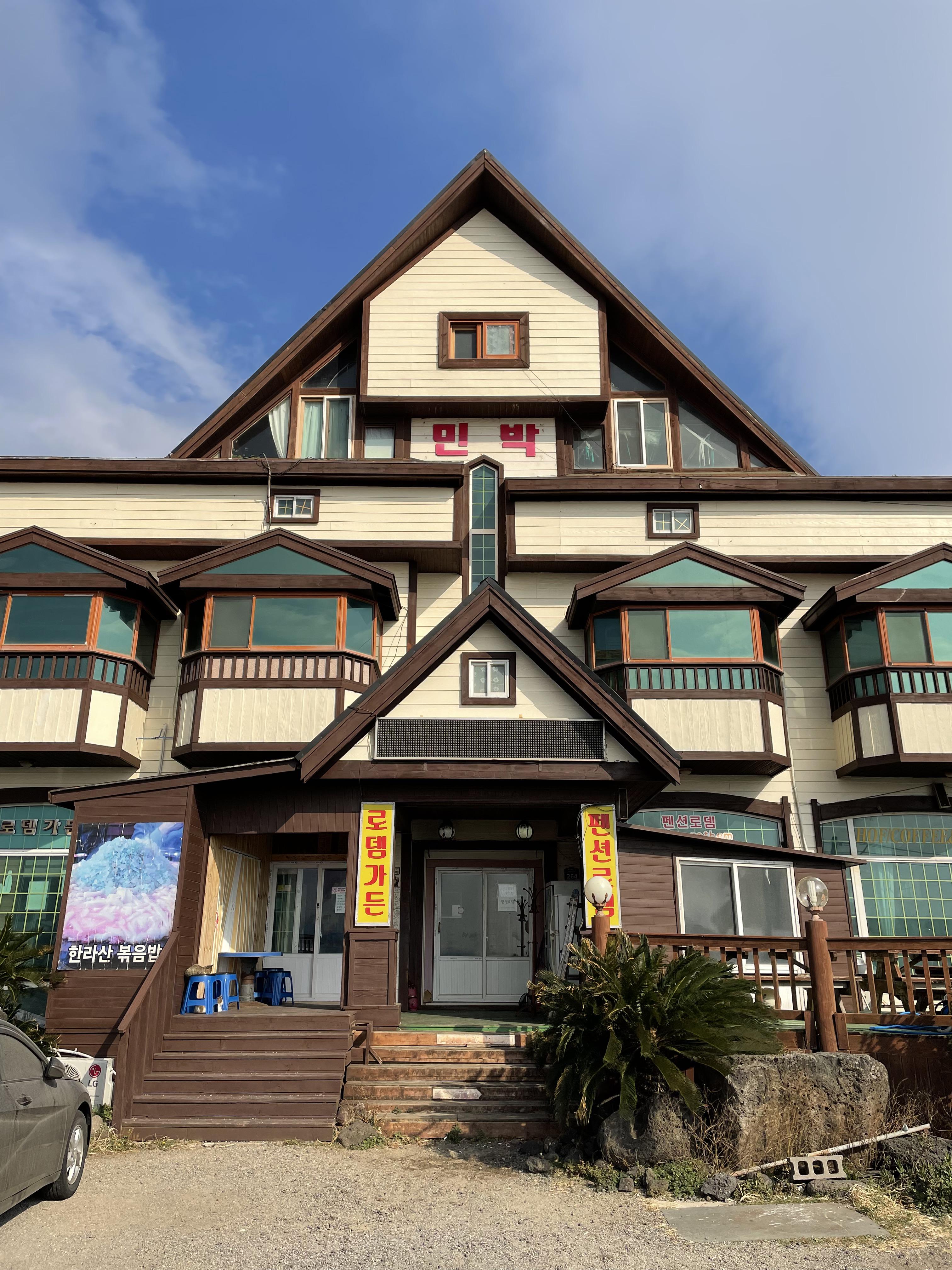 큰 길가에 펜션같이 생긴 건물이 있다.
