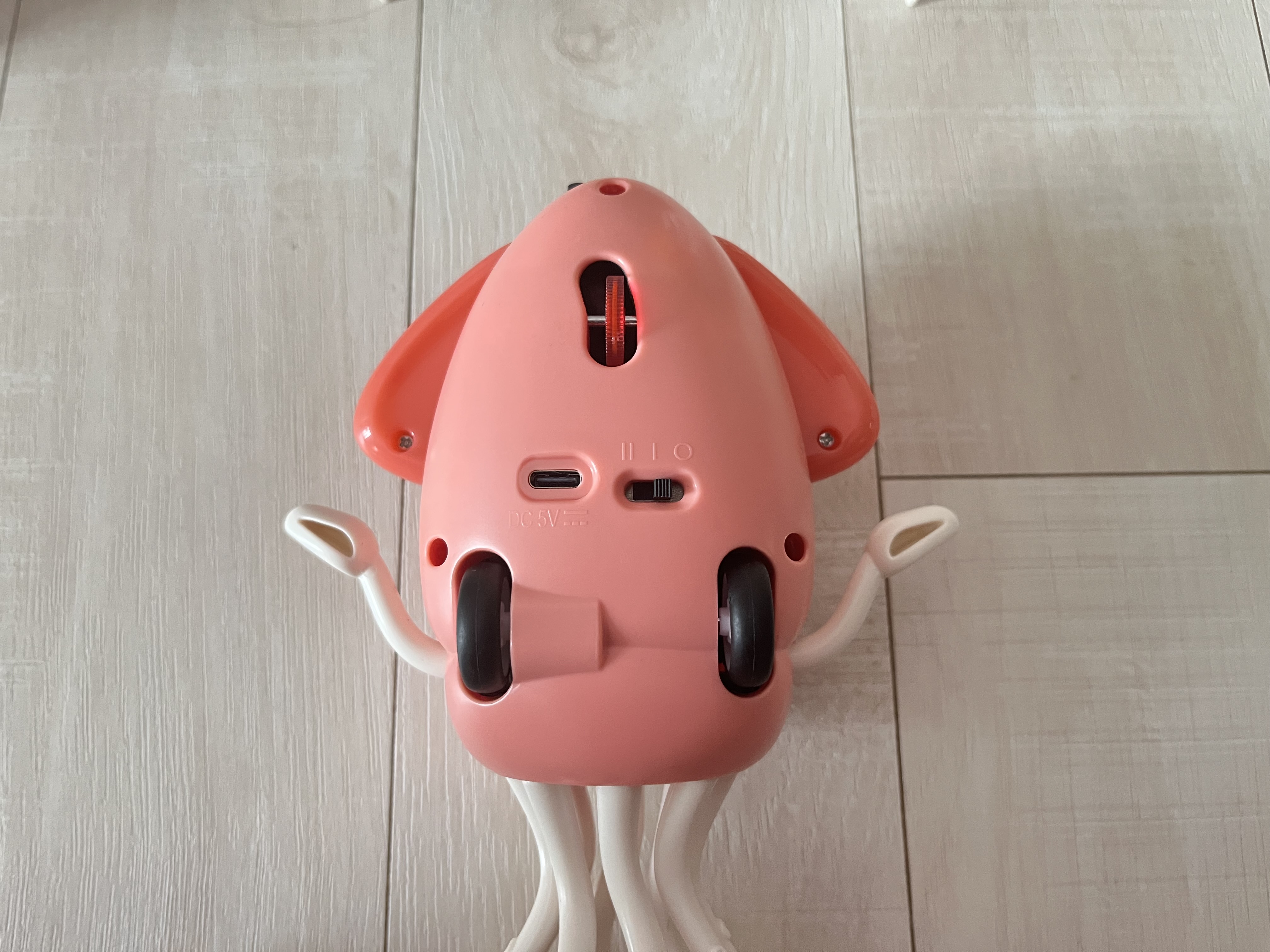 춤추는 오징어를 눕혀놓으면 뒷면의 바퀴를 이용해 이리저리 돌아다닌다.
