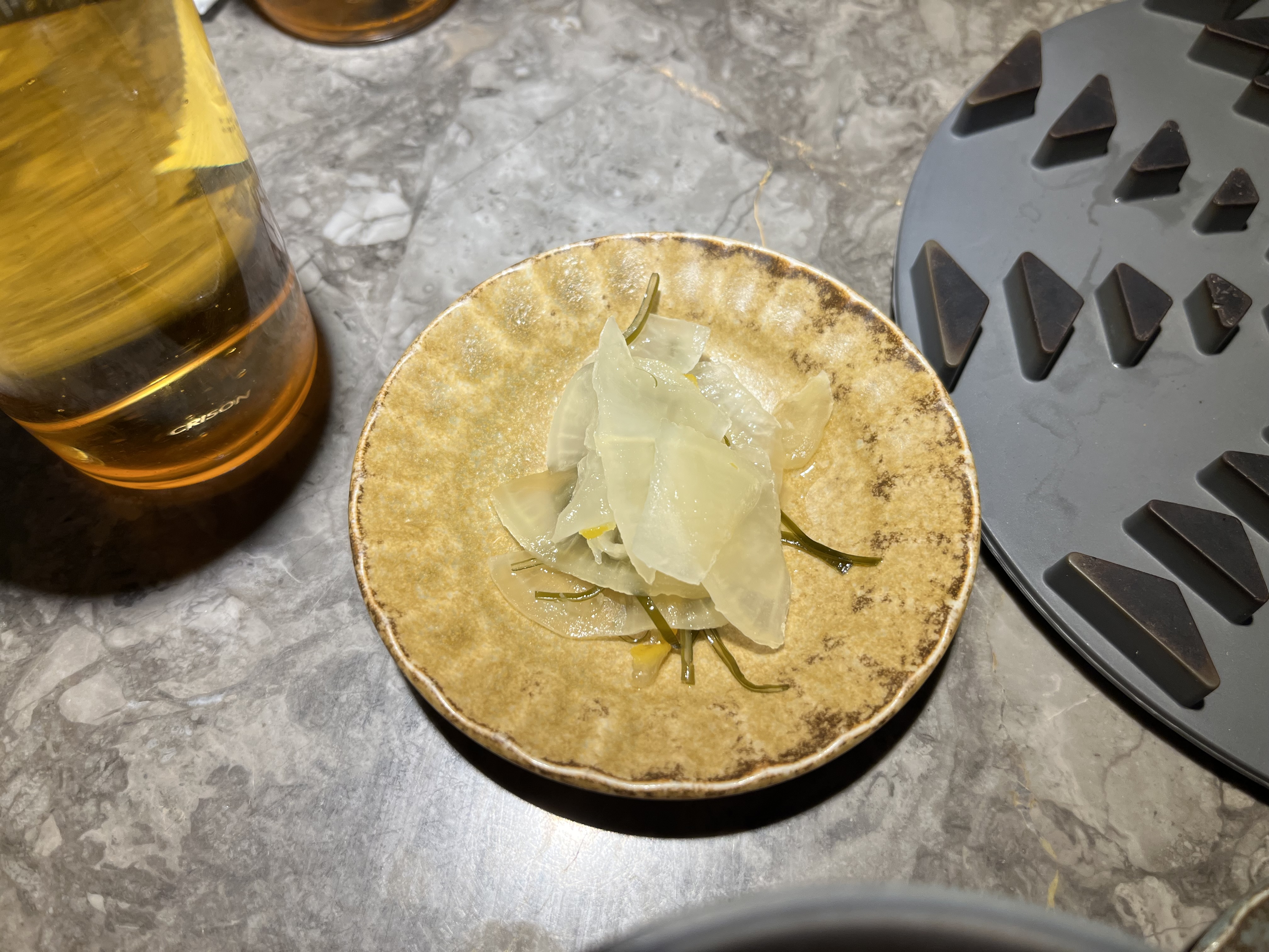 양파절임 위에 소스에 살짝 절인 흰살생선 요리다.