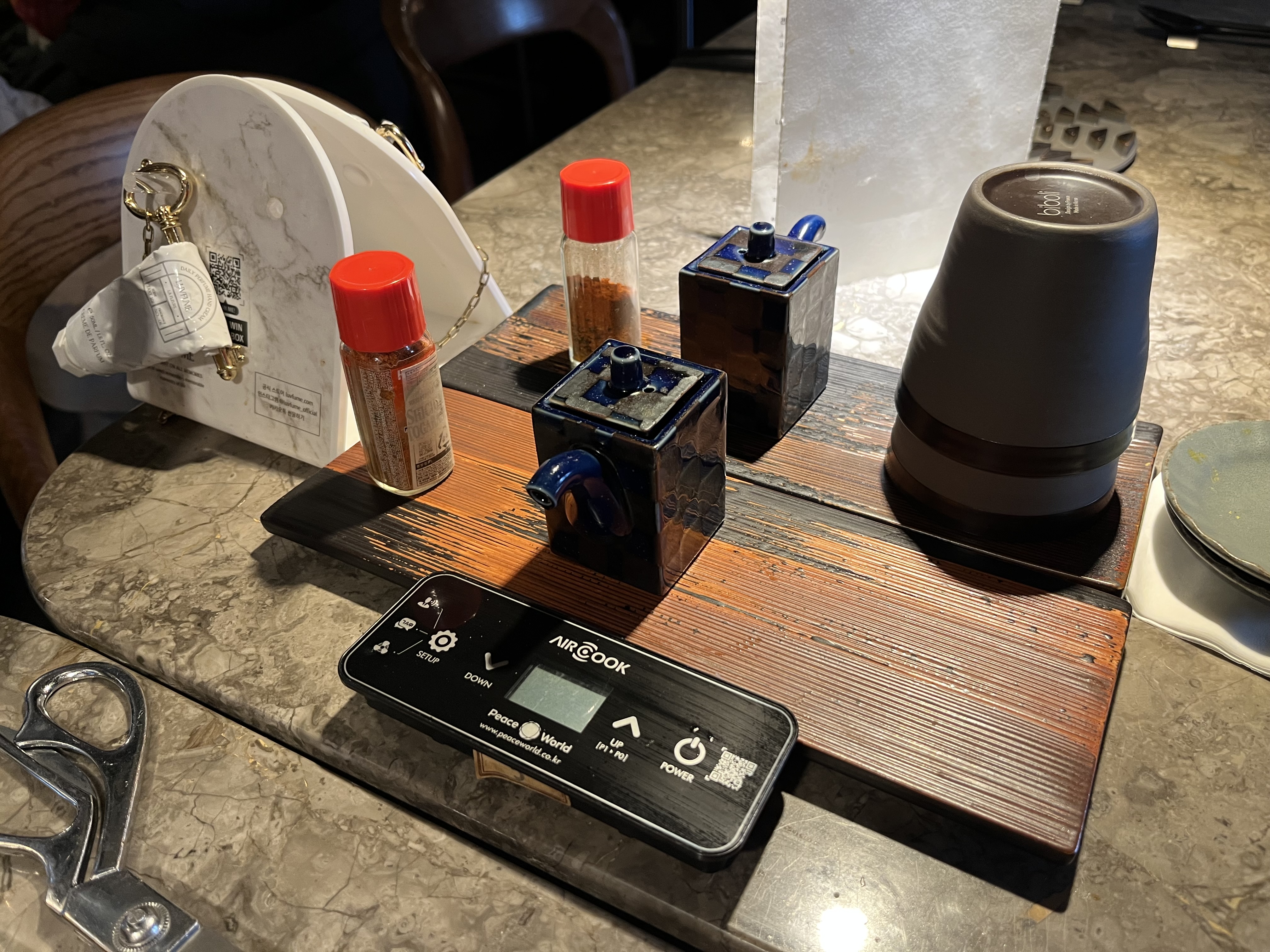 물컵이랑, 양념장, 핸드크림과 불 조절할 수 있는 컨트롤 패널.