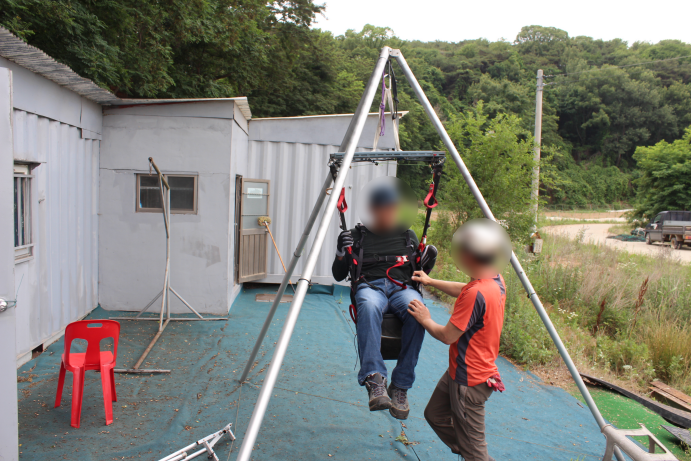 피팅용으로 만들어 놓은 삼각대 같이 생긴 장비에 하네스를 건다.