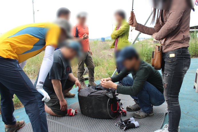 그리고 하네스 위에 올라앉아 이것저것 몸에 맞게 조절한다.