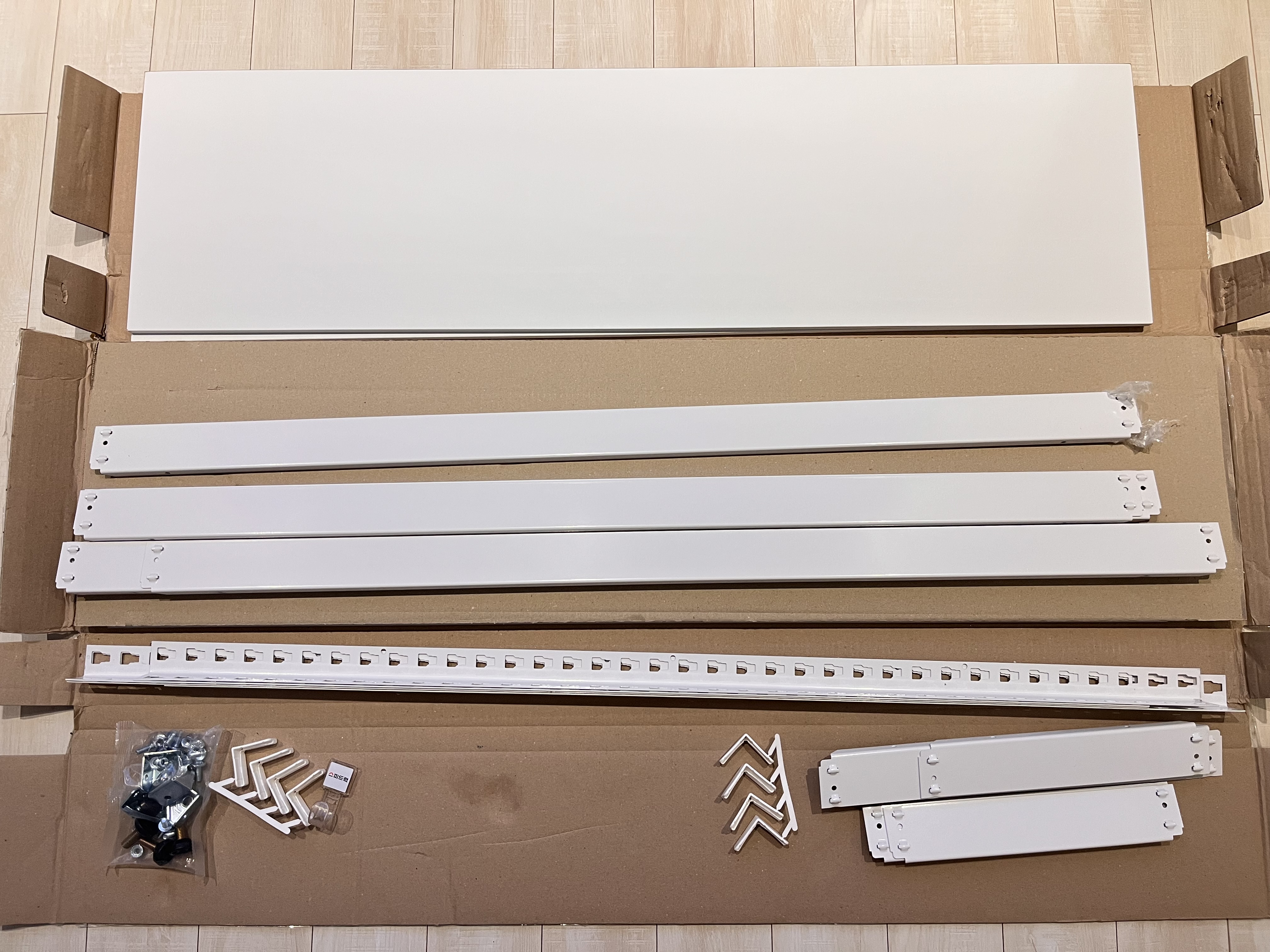 박스 안에는 기둥과 가로받침, 세로받침, 그리고 별도로 주문한 높이 조절좌 세트, 그리고 플라스틱 망치가 들어있다.