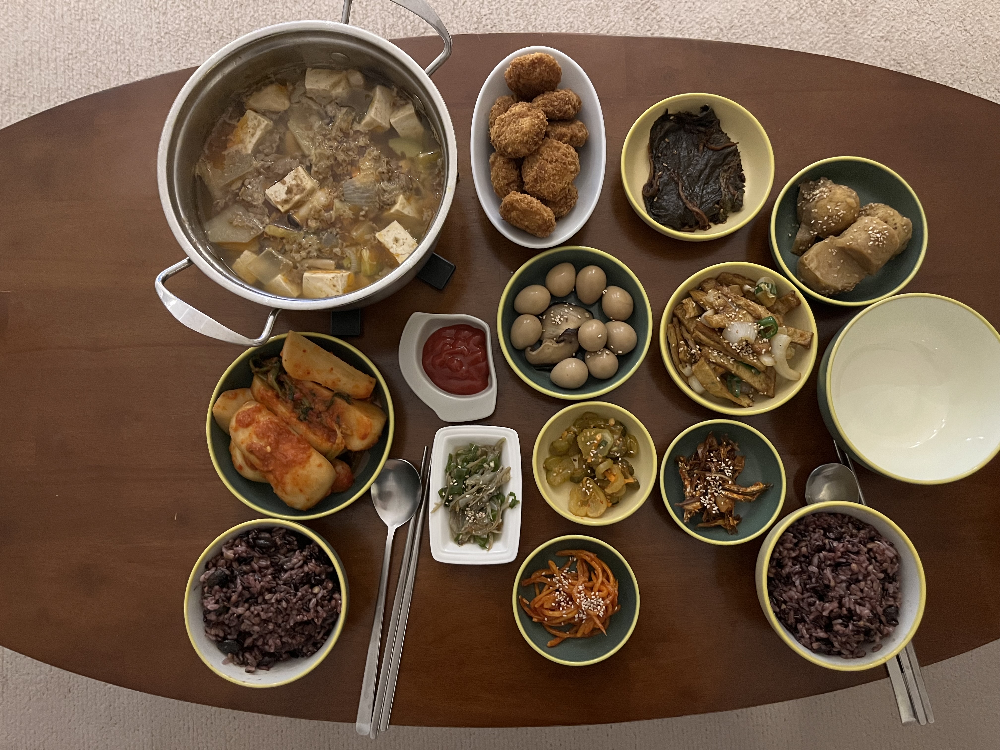 반찬이 워낙 많아 커다란 쟁반에 가득 담아 식탁으로 옮긴다.