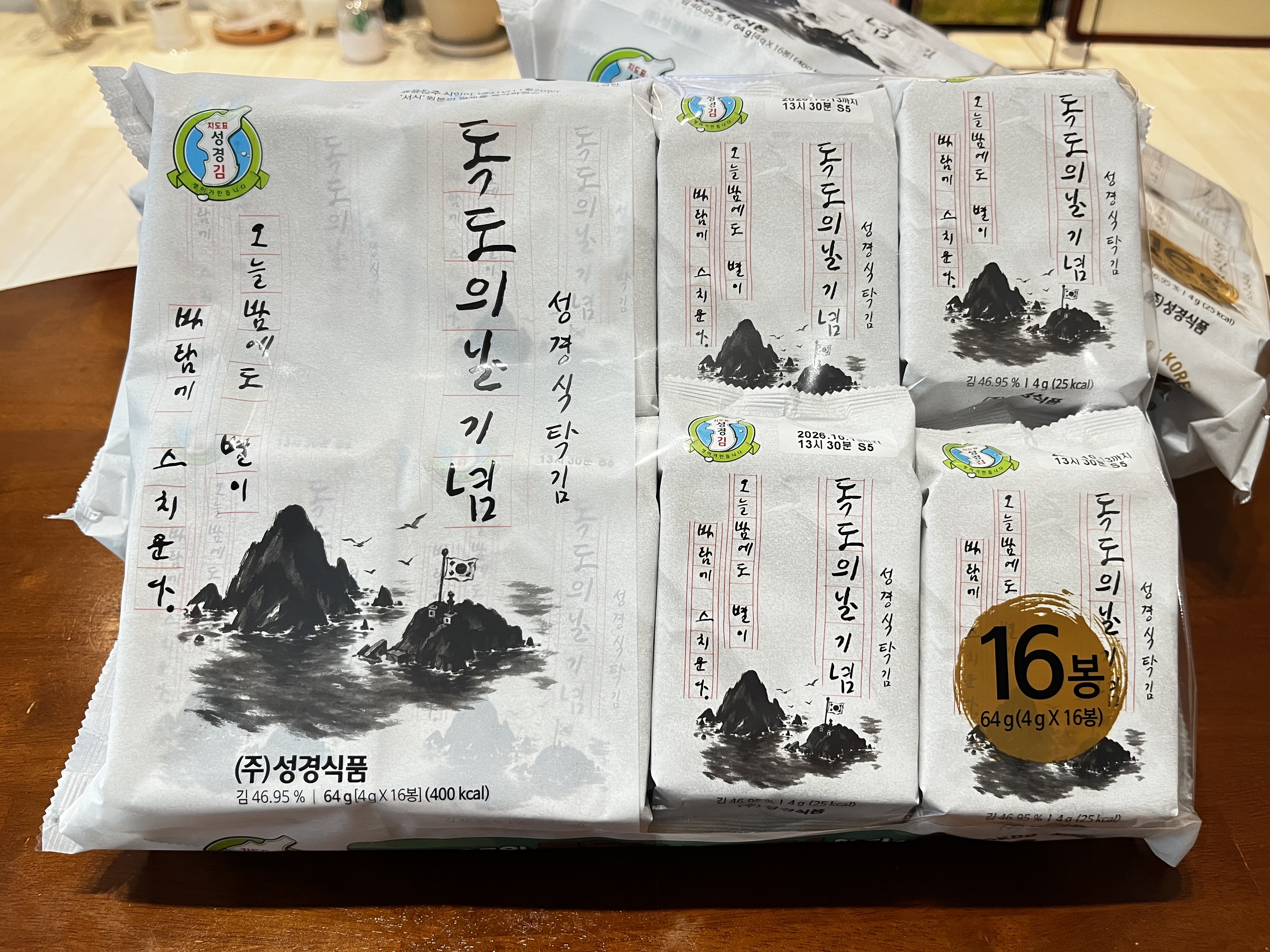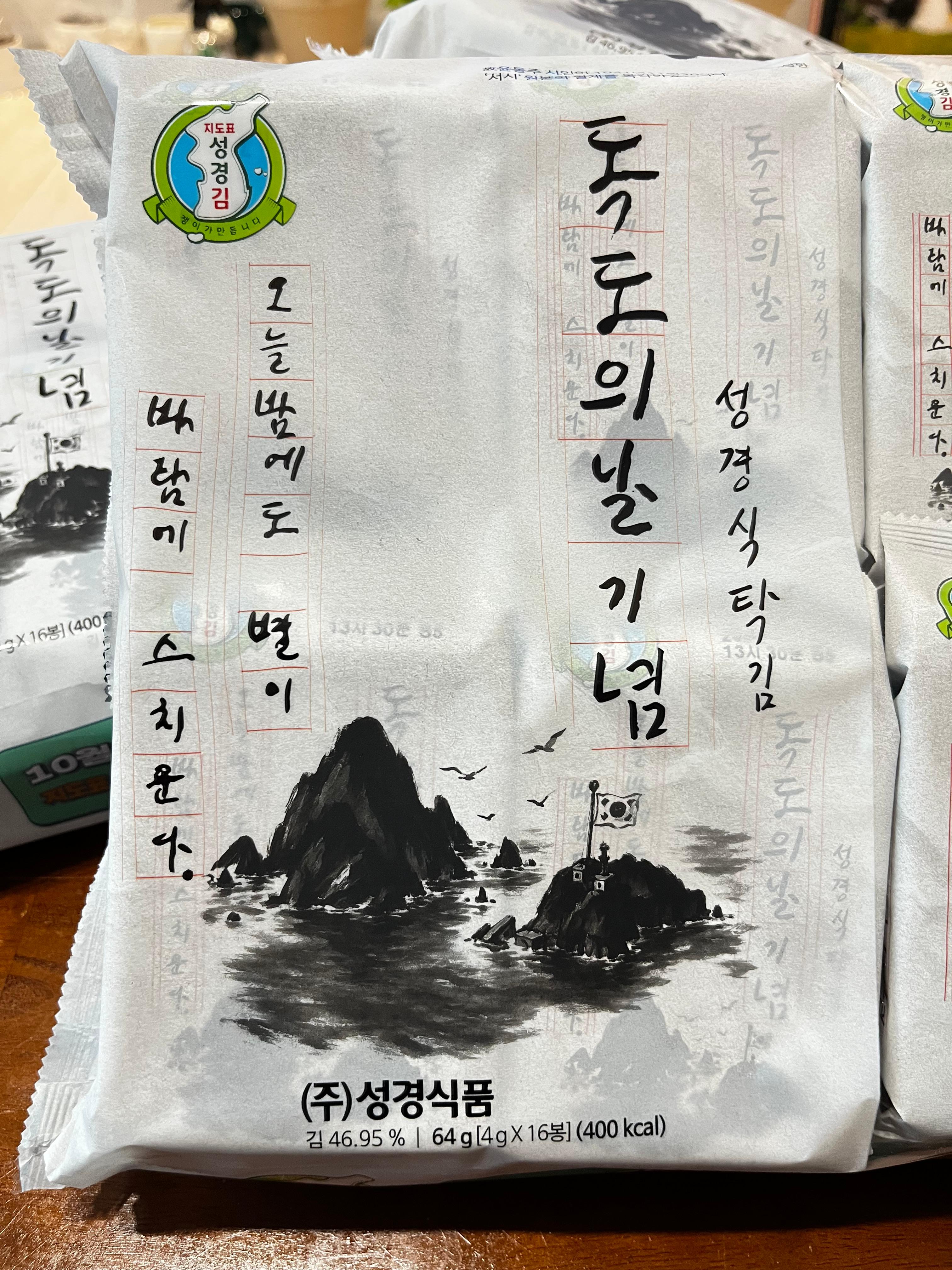우리는 김을 참 좋아한다.집에서 밥 먹으면 도시락김 3~4개는 기본으로 먹는다.그중에 성경김을 주로 사서 먹는다.포장에 있는 우리나라 지도에 독도가 그려져 있고,독도 표기를 수정하고 수출